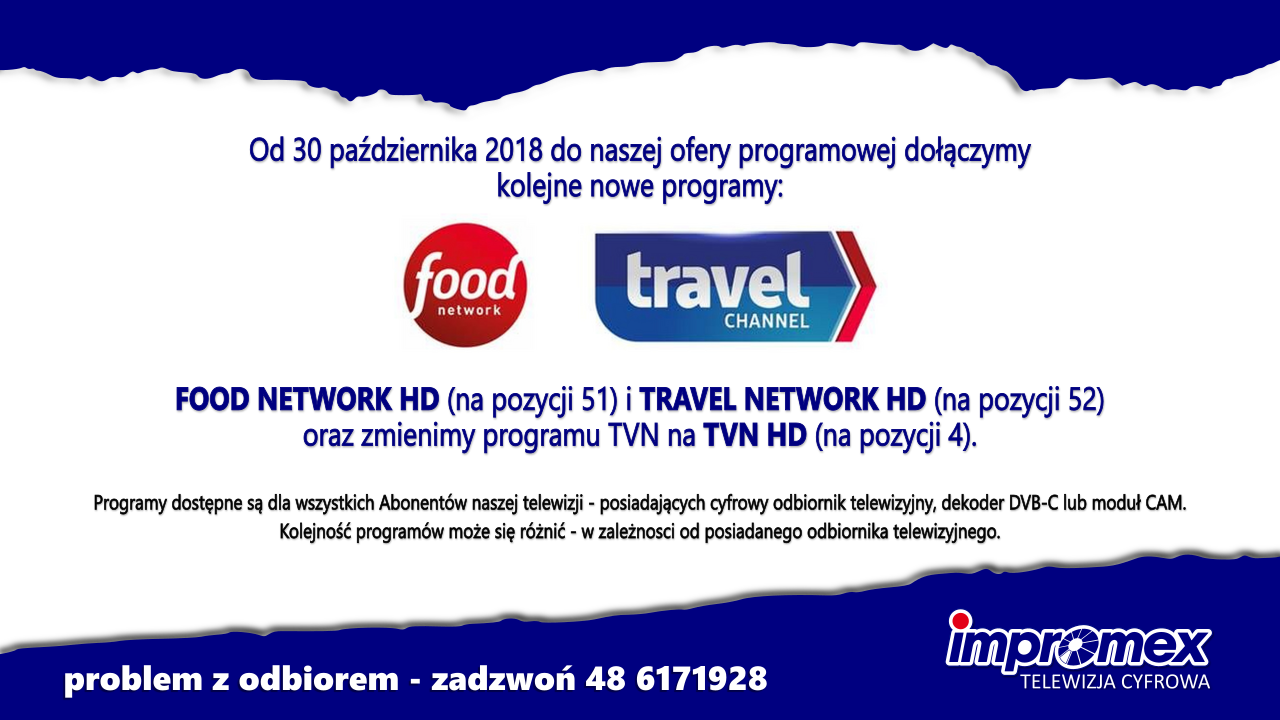 Od 31 października 2018 do programów Cyfrowej Telewizji Kablowej IMPROMEX dołączą dwa programy: